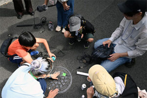 今回のワークショップでは、水路の上に整備された道路を舞台に、マイクを使って地下水路から響く音、石や道具で地面を叩いたり擦ったりした音を録音して曲を制作しました。