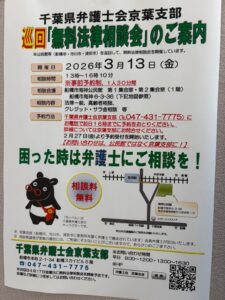 本日は,私が所属しております千葉県弁護士会京葉支部が主催する『無料法律相談会』のご案内です。