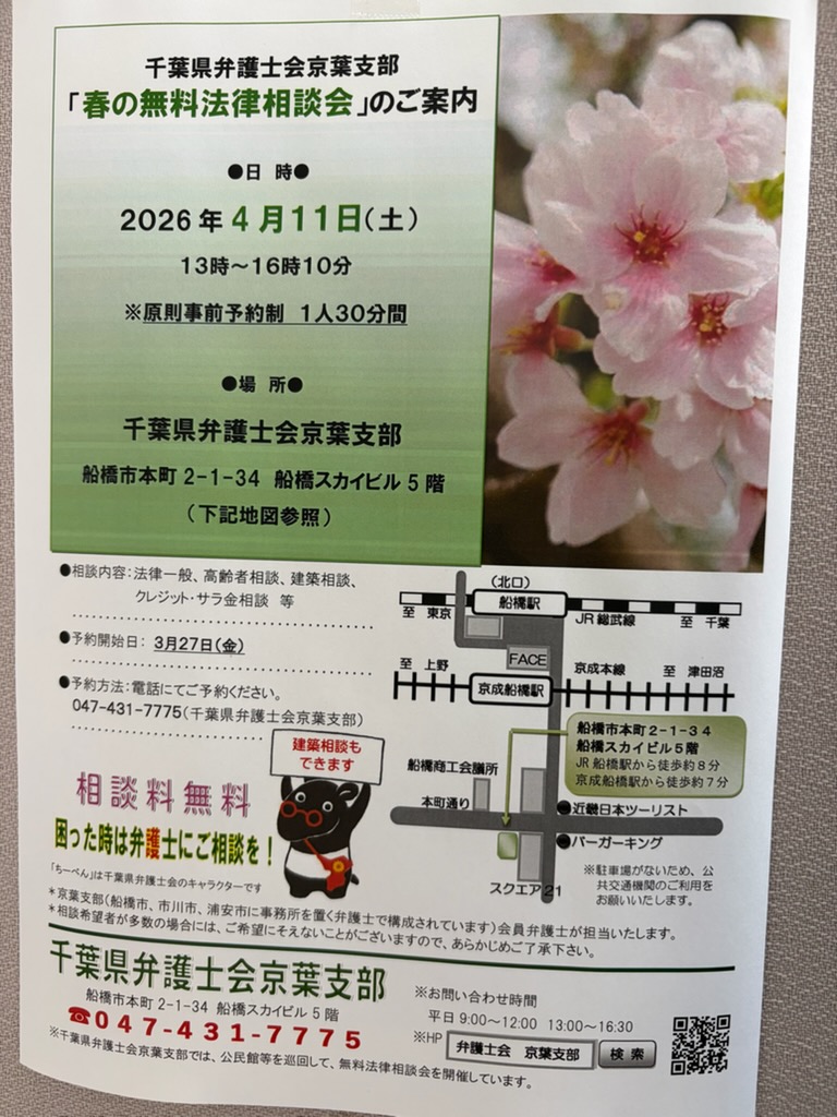 本日は,私が所属しております千葉県弁護士会京葉支部が主催する『春の無料法律相談会』のご案内です。