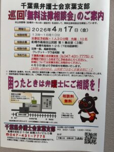 本日は,私が所属しております千葉県弁護士会京葉支部が主催する『無料法律相談会』のご案内です。