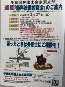 本日は,私が所属しております千葉県弁護士会京葉支部が主催する『無料法律相談会』のご案内です。