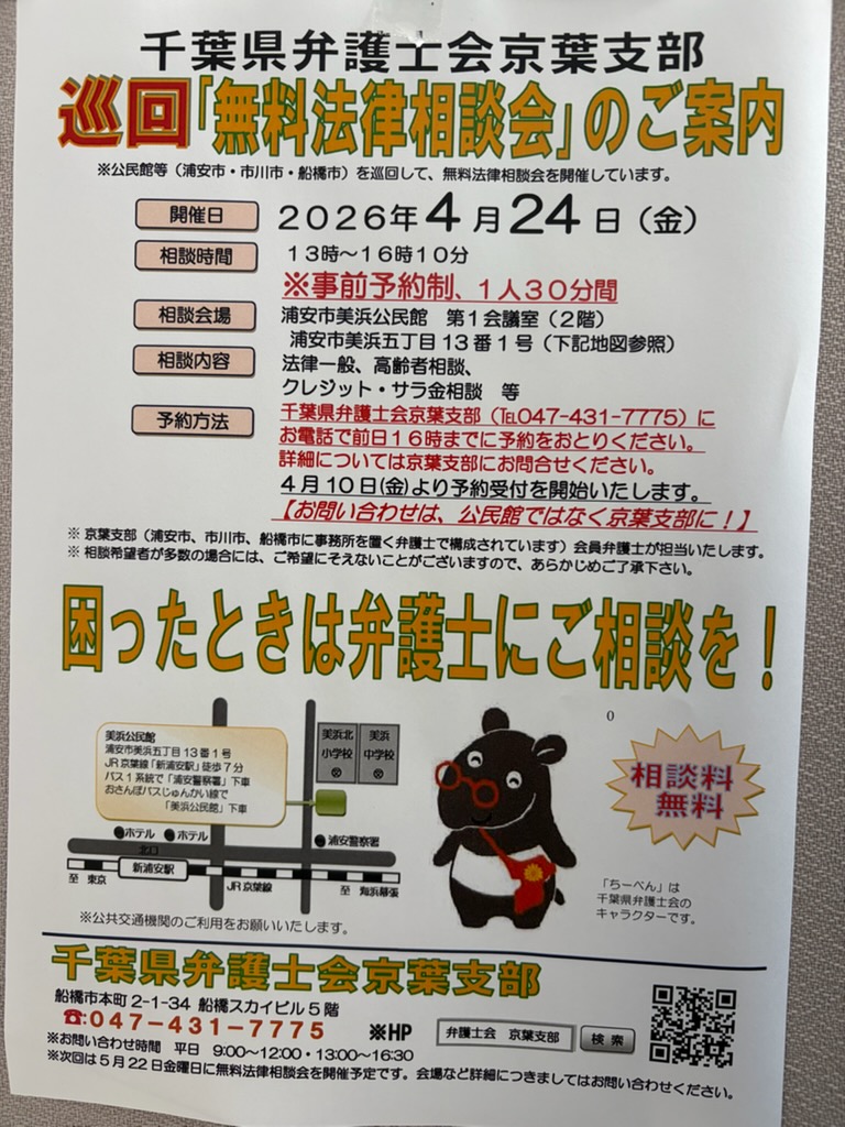 本日は,私が所属しております千葉県弁護士会京葉支部が主催する『無料法律相談会』のご案内です。