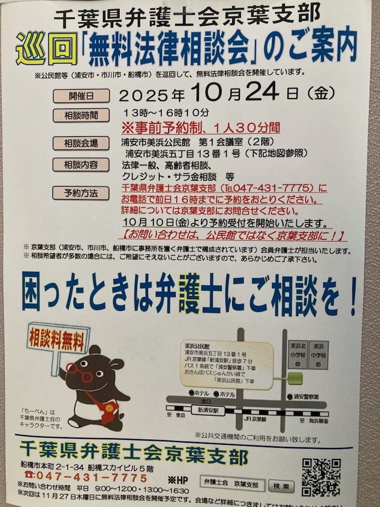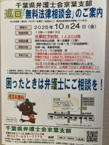 本日は,私が所属しております千葉県弁護士会京葉支部が主催する『無料法律相談会』のご案内です。