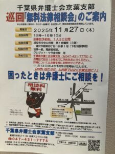 本日は,私が所属しております千葉県弁護士会京葉支部が主催する『無料法律相談会』のご案内です。