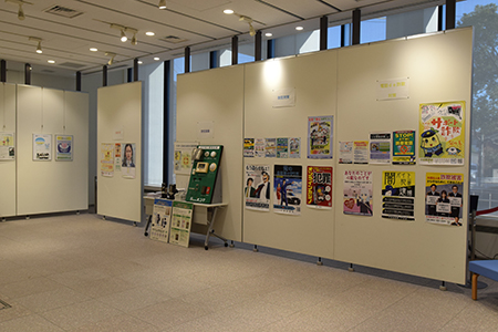 この展示は,防犯,交通安全,犯罪被害者等支援に関する市民意識の醸成を図る目的で行っており,さまざまな啓発パネルやポスターの掲示のほか,住宅侵入警報装置やドア錠などの防犯設備や,自転車乗車用ヘルメットなどを紹介しています。